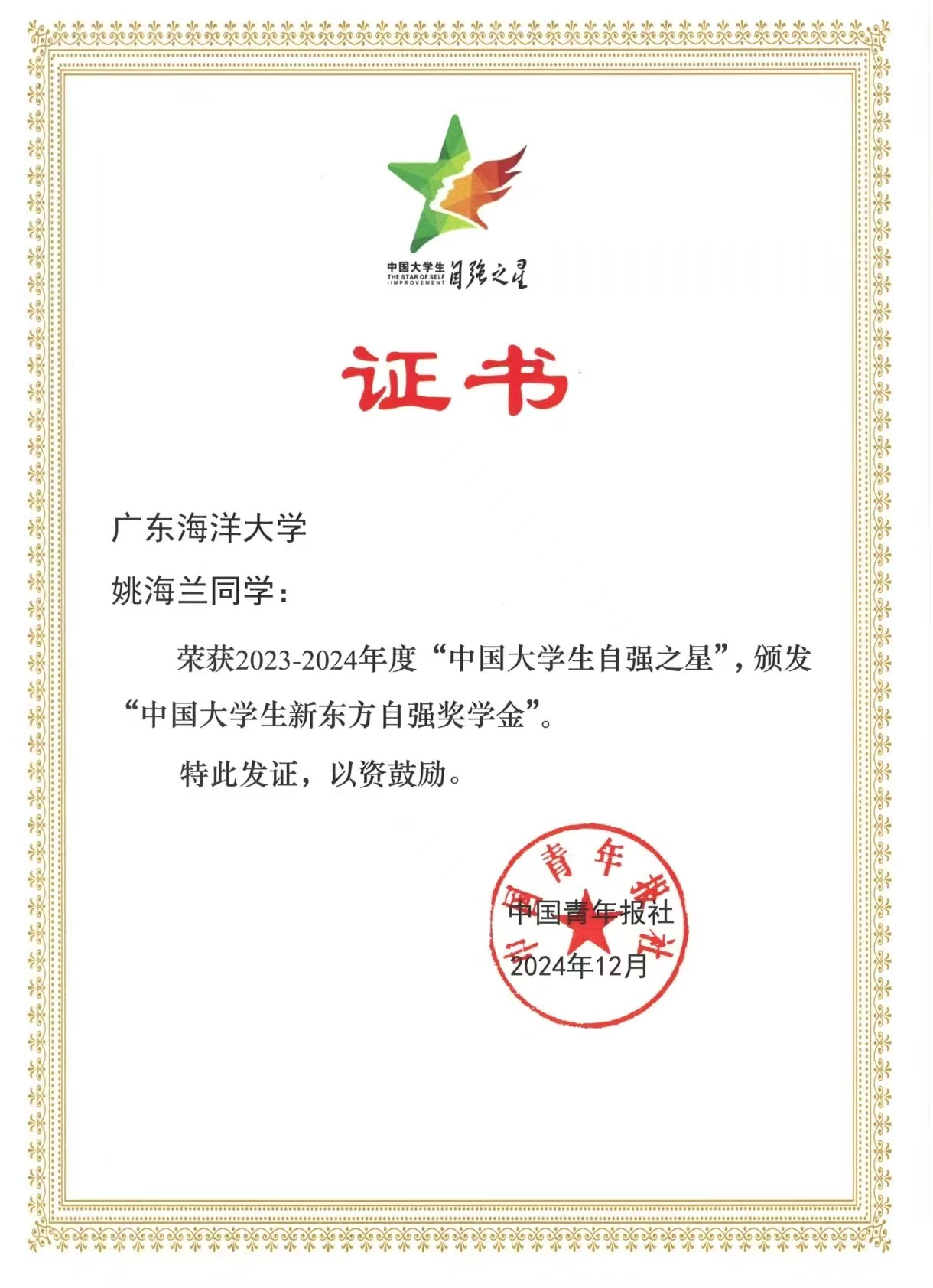 姚海兰同学脱颖而出,成功斩获“中国大学生自强之星”称号,同时荣获“中国大学生新东方自强奖学金”。