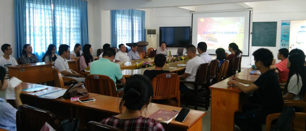 宋雅传达了广东省委教育工委和学校党委《关于认真学习宣传贯彻党的十八届六中全会精神的通知》,并全面解读党的十八届六中全会精神,要求全体党员身体力行,深刻领会十八届六中全会的精神实质,深刻领会习近平总书记在全会上的重要讲话精神,迅速掀起学习宣传贯彻十八届六中全会精神的热潮。十八届六中全会专题研究全面从严治党重大问题,审议通过《关于新形势下党内政治生活的若干准则》(以下简称《准则》)和修订后的《中国共产党党内监督条例》(以下简称《条例》),为新形势下加强和规范党内政治生活、强化党内监督提供了新的制度遵循,对于深化全面从严治党,解决党内存在的突出矛盾和问题,有效应对党面临的“四大考验”、克服“四种危险”,不断增强党自我净化、自我完善、自我革新、自我提高能力,具有十分重要的意义。