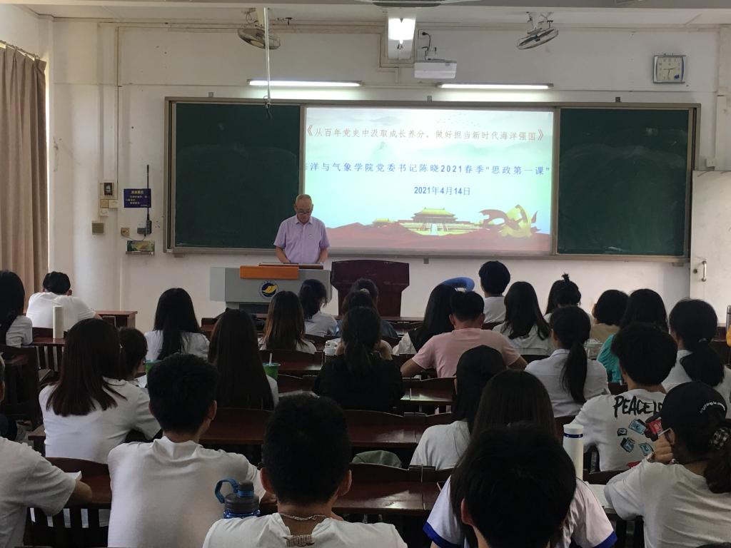 党委书记陈晓在湖光校区钟海楼开讲2021年春季学期党委书记“思政第一课”,他以“从百年党史中汲取成长养分,做好担当新时代海洋强国使命”为题讲授了一堂生动的党史学习教育课。爱壹帆