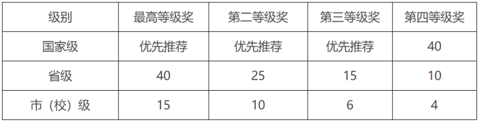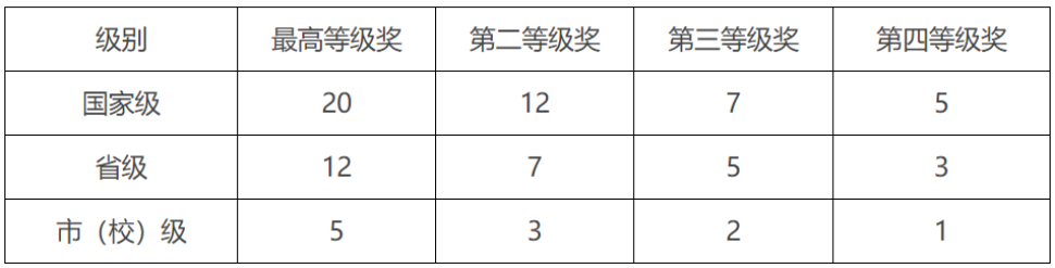 各类奖项完成者中排名第二至第五的学生分数分别=排名第一分数×0.6、0.5、0.4、0.3。同一项目获不同级别奖励,不重复计分。