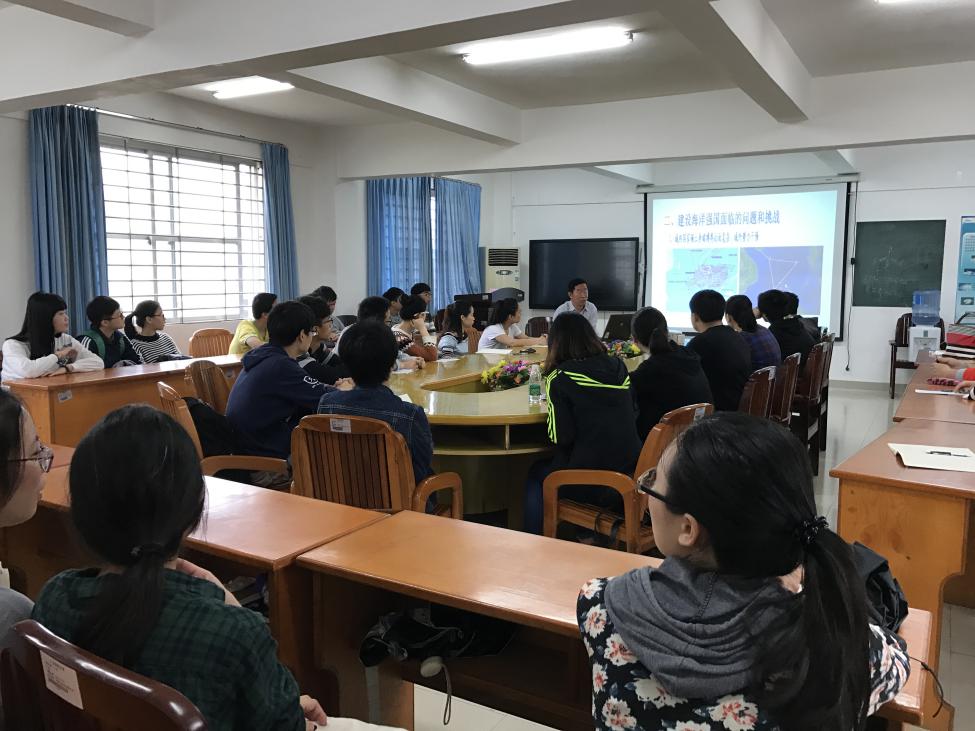 张书文以《建设海洋强国与我们的使命》为题,首先分析了当前复杂多变的国内外环境,接着围绕为什么要建设海洋强国、建设海洋强国面临的问题与挑战、中国海洋高端人才严重缺乏展开了详细论述。他强调,海洋强国战略是中国走向强国的一条必经之路,海洋强则中国强,当代大学生必须坚定理想与信念,树立远大的理想和抱负,勇于献身于我国海洋强国事业。