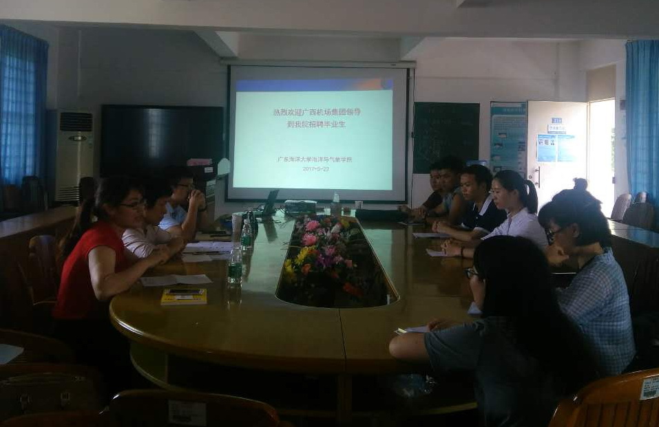2017年5月23日下午,广西机场集团公司属下的百色机场和北海机场一行三人到爱壹帆 海博楼二楼学术报告厅对2017届大气科学毕业生进行面试。