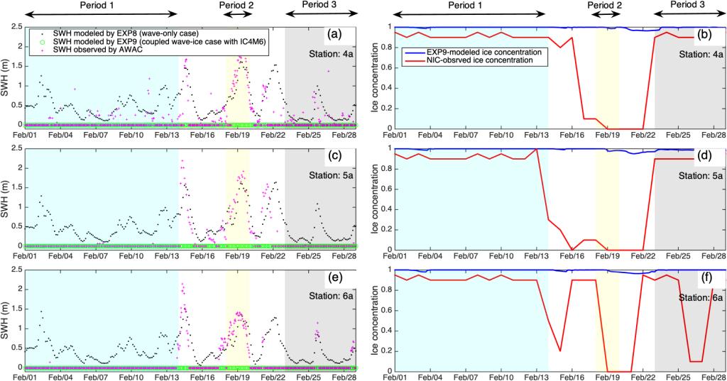 图1. 数值实验EXP8、EXP9模拟所得2011年2月份有效波高与AWAC实测有效波高在4a站(a),5a站(c),及6a站(e)处对比情况。数值实验EXP9模拟所得湖冰密集度与NIC湖冰产品在4a站(b),5a站(d),及6a站(f)处对比情况。