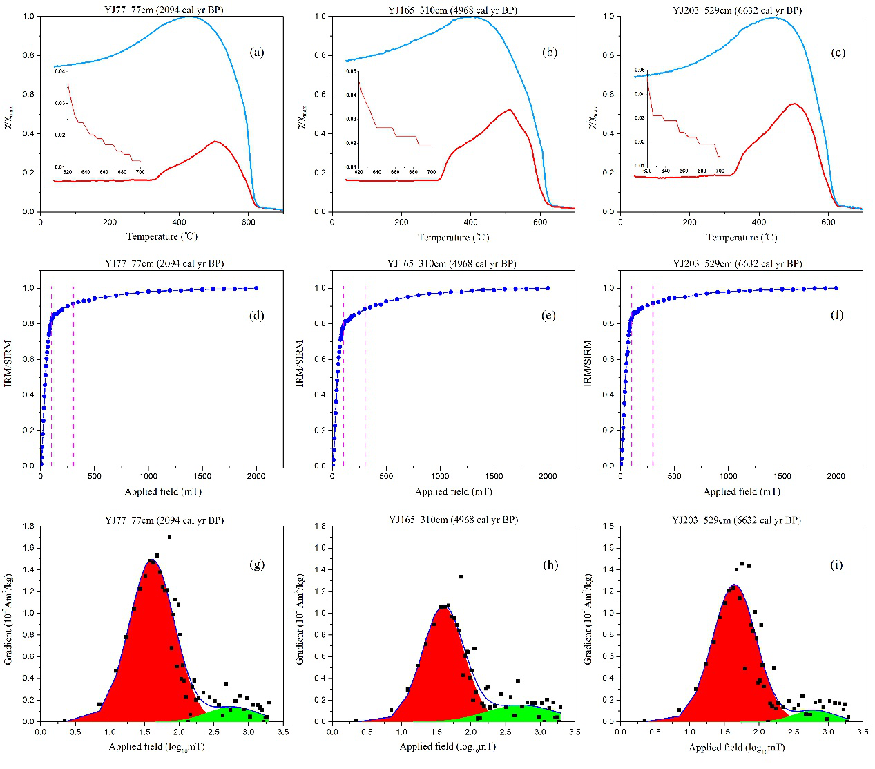 爱壹帆海洋地质团队成员黄超利用采自南海北部大陆架粤西泥质区的YJ Core岩芯做为研究对象(图1),通过210Pb和AMS 14C两种测年方法建立YJ Core岩芯的年龄–深度模式,开展系统的环境磁学研究工作,分析研究区沉积物的磁性参数的变化特征,并探讨研究区沉积物磁性特征的环境意义。该研究获取了研究区域过去7500年以来的高分辨环境磁学记录。研究表明YJ Core岩芯沉积物中的磁性矿物为碎屑成因,磁性矿物主要是磁铁矿,同时也含有少量的赤铁矿(图2)。YJ Core岩芯沉积物中磁性特征对气候变化响应灵敏,记录了过去7500年以来东亚夏季风的演变历史(图3)。7500–6800 cal yr BP期间,成壤作用的环境磁学χARM/χ和χARM/SIRM比值都依然保持相对较高的值,反映强盛的东亚夏季风;6800–3500 cal yr BP期间,磁性矿物含量指标ARM和磁性矿物粒度指标χARM/χ和χARM/SIRM的含量相对较高,可能反映相对湿润的气候,进而可能指示该时期相对强盛的东亚夏季风;3500–2000 cal yr BP期间,ARM和χARM/χ和χARM/SIRM相对较低,表明东亚夏季风相对较弱;近2000年以来,由于人类活动逐渐增强,YJ Core岩芯沉积物环境磁学指标可能不仅仅受气候变化的控制,而且可能主要受到日益增强的人类活动的影响。