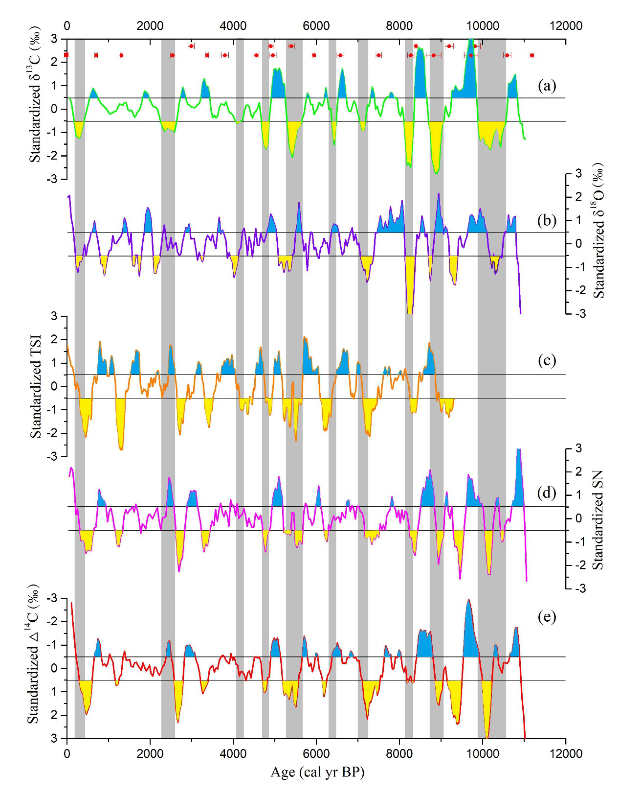 爱壹帆海洋地质团队成员黄超经过反复的条件实验,建立了适合泥炭岩芯样品的α-纤维素提取方法,基于在北疆阿勒泰山获取的长达7.5m的泥炭岩芯,开展α-纤维素碳同位素研究,并结合在泥炭地海拔梯度上开展为期2年的现代观测结果(图1),论证了阿勒泰泥炭α-纤维素碳同位素是一个比较可靠的古温度指标,重建了该研究区域过去11500年以来夏季温度的演化历史(Rao and Huang, 2019)。并且发现该区域夏季温度还呈现千年尺度和百年尺度的波动变化特征。千年尺度上,阿勒泰泥炭α-纤维素碳同位素清晰的记录了数次明显的气候突变事件,与北大西洋浮冰碎屑事件具有较好的对应关系(图2),说明北大西洋的温度变化可通过西风环流对中亚干旱区的温度产生一定的影响。百年尺度上,将阿勒泰泥炭α-纤维素碳同位素记录、太阳活动指标(TSI、SN以及△14C)同时进行标准化处理,剔除长期变化趋势,获得百年尺度的变化信息,并进行对比分析。结果发现,阿勒泰地区的夏季温度的异常变化刚好与减弱的太阳活动吻合(图3),说明百年尺度上阿勒泰地区的夏季温度变化主要受到太阳活动的影响。为了进一步确定阿勒泰地区夏季温度与太阳活动之间的关系,我们对阿勒泰泥炭记录与太阳活动指标SN和△14C分别进行时间序列的滤波分析和交叉谱分析,结果发现存在数个显著的百年太阳活动周期。这些对比分析进一步表明,阿勒泰地区百年尺度的温度异常变化受控于太阳活动的影响。