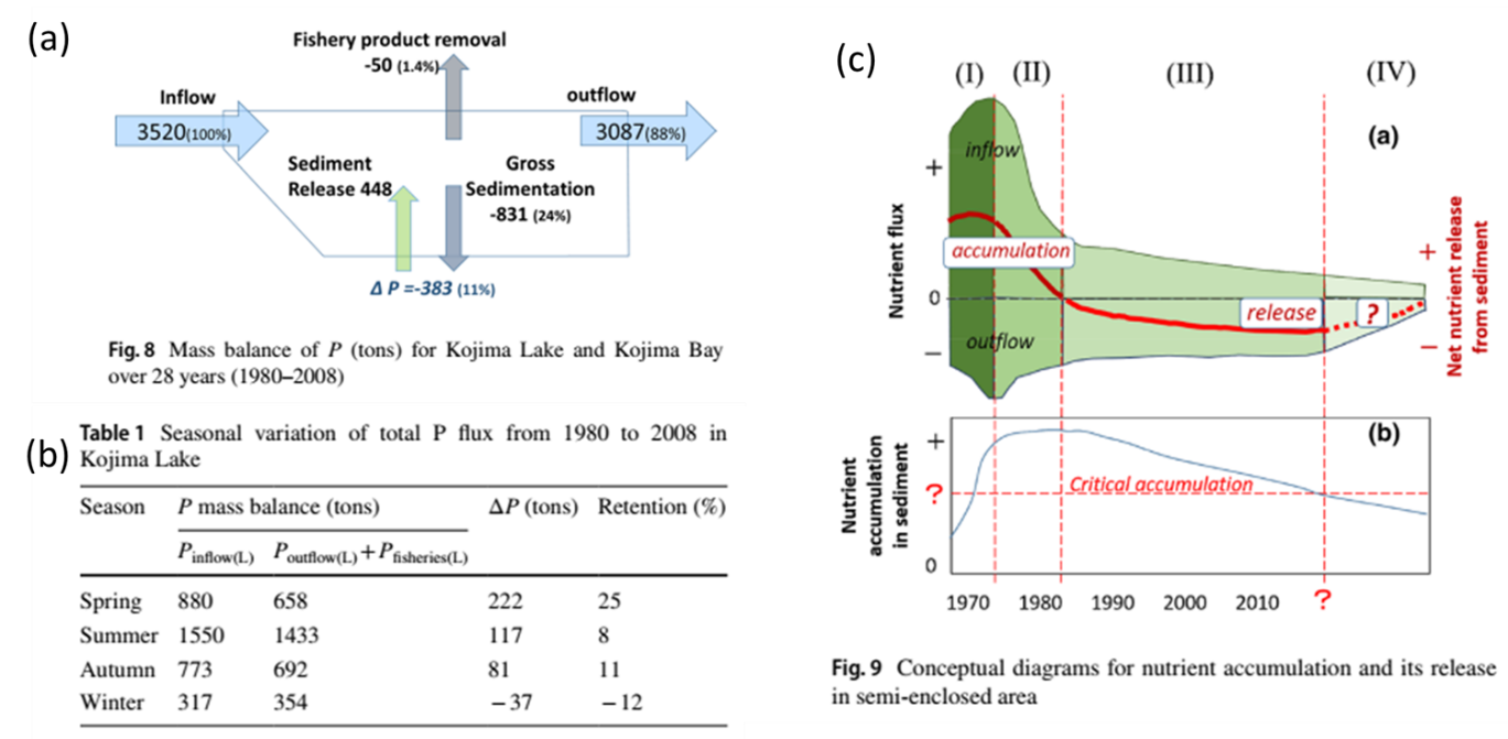 海洋化学团队基于对日本濑户内海儿岛湾的长期观测数据,结合表层沉积物,柱状沉积物,水体磷数据和通过沉积物柱重建的磷收支的变化,构建了总长28年的近海磷收支模型。模型指出近海沉积物磷蓄积的明显变化,沉积物磷蓄积量从1980年大约15 g m-2 yr-1即降低到2009年的负值,揭示近海磷库逐渐从蓄积磷转向释放这一过程。沉积物数据和模型数据的对比发现,儿岛湾区域沉积物磷库蓄积的磷为383吨,占整体输入磷的11%,而表层沉积物中整体磷库的大小约为1288吨,约为过去28年磷蓄积量的4倍左右。这一结果也表明,在1980年以前的环境事件造成的磷蓄积量远超现在,而且仍然在持续影响目前区域磷循环过程,沉积物临界蓄积量的指标实际上是衡量区域富营养化恢复与否的重要指标。研究最后总结近海富营养化对富营养化治理响应的4个过程,即,1、输入营养盐增加,输入大于输出,此时临界蓄积量快速增加;2、通过治理,输入营养盐开始减少,但输入大于输出,临界蓄积量停止增加;3、输入营养盐持续减少,输出大于输入,沉积物磷库开始调节磷循环过程,此时临界蓄积量开始减少;4、输入持续减少,输出大于输入,沉积物磷库对磷循环的调节过程接近稳定,此时临界蓄积量接近0或为负值。实际只有等到第四个步骤才接近完成了整个富营养化恢复的过程。