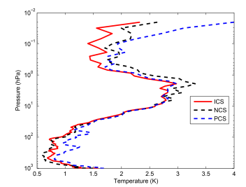 ICS 是本方法改进后的通道选择,PCS是改进前的通道选择,NCS是欧洲数值中心的通道选择,通过改进后的通道选择方法(ICS)的温度反演精度在上对流层-平流层有所提高,尤其是在平流层的温度反演。