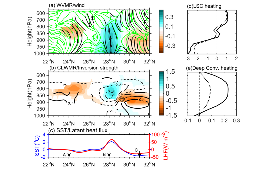 图2. 控制试验与平滑海洋锋试验差值的垂直剖面图. (a) 水汽混合比 (填色, g kg−1) 和垂直环流(流线, 黑色流线超过95%显著性检验); (b) 云水混合比(填色, 10−5 kg kg−1) 和逆温层强度(等值线, K (100 hPa)−1). 仅展示置信度超度95%的区域。(c) 海表温度(蓝线, °C) 和潜热通量(红线, W m−2)。 (d-e) 大尺度凝结潜热加热率和深对流加热率垂直廓线 (K day−1, 实线和点线分别表示控制试验和平滑海洋锋试验);