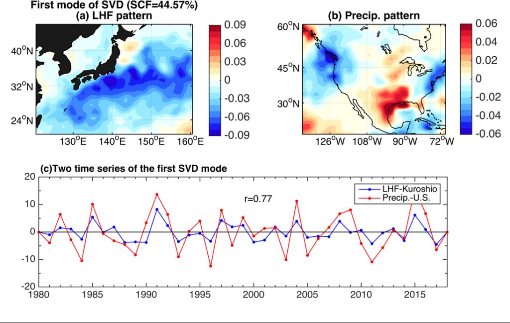 图1.(a)黑潮及其延伸体区海表潜热通量和(b)北美春季降雨SVD主模态,(c)与(a-b)相对应的时间序列。