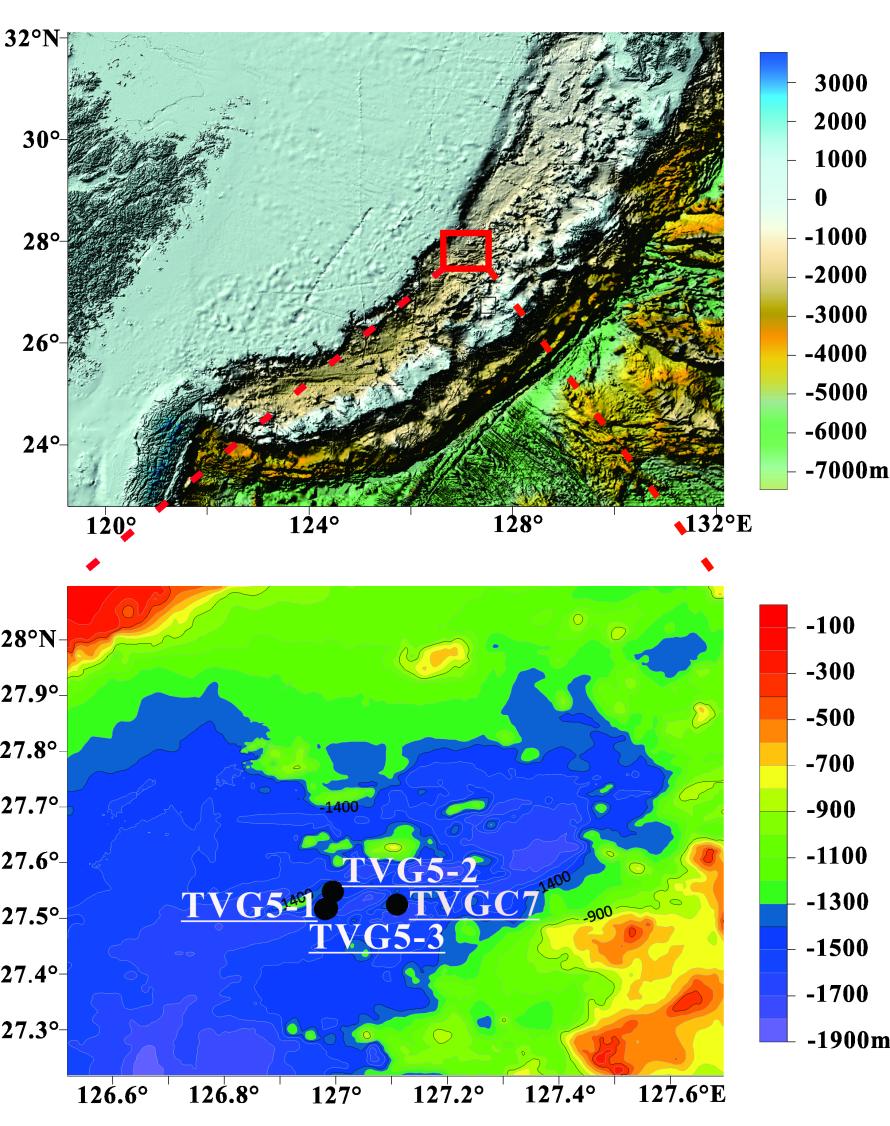 图1.冲绳海槽Clam热液区水深和地质背景图