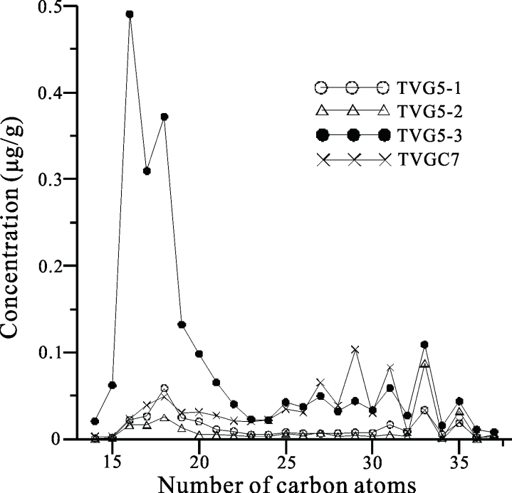图2.热液产物样品中正构烷烃分布图