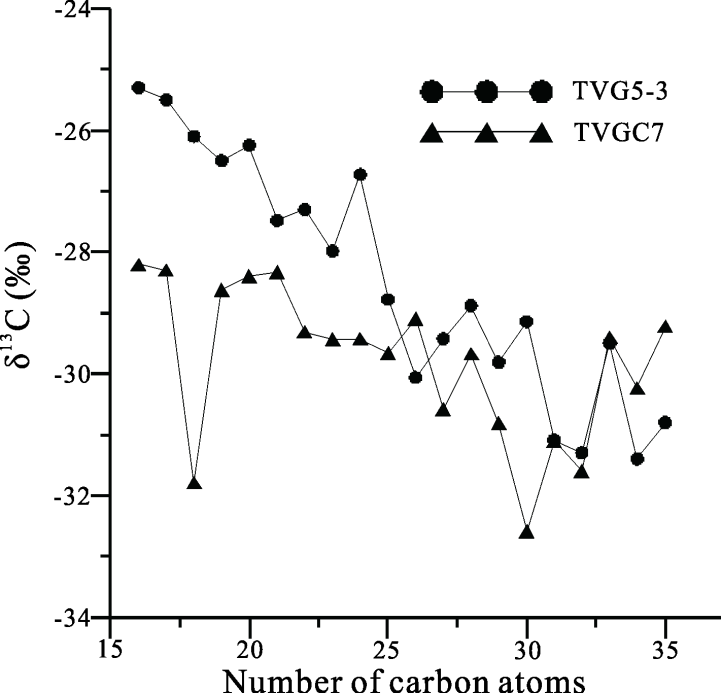 通过研究表明,蚀变岩石和远洋沉积物样品中正构烷烃(图2)呈现出明显的双峰分布,同时高分子正构烷烃具有明显的奇数碳优势,表明蚀变岩石和远洋沉积物样品中正构烷烃主要来源于陆源高等植物的输入;热液硫化物和热液沉积物中低分子正构烷烃(图2)占主要成分,同时呈现出明显的偶数碳优势,可能是水生生物和热液微生物共同作用的结果;热液沉积物中正构烷烃单体碳同位素(图3)表现出随着碳元素个数增加δ13C值减小的趋势,暗示出热液沉积物中部分的正构烷烃可能来源于非生物合成作用,其非生物合成正构烷烃不能忽略。