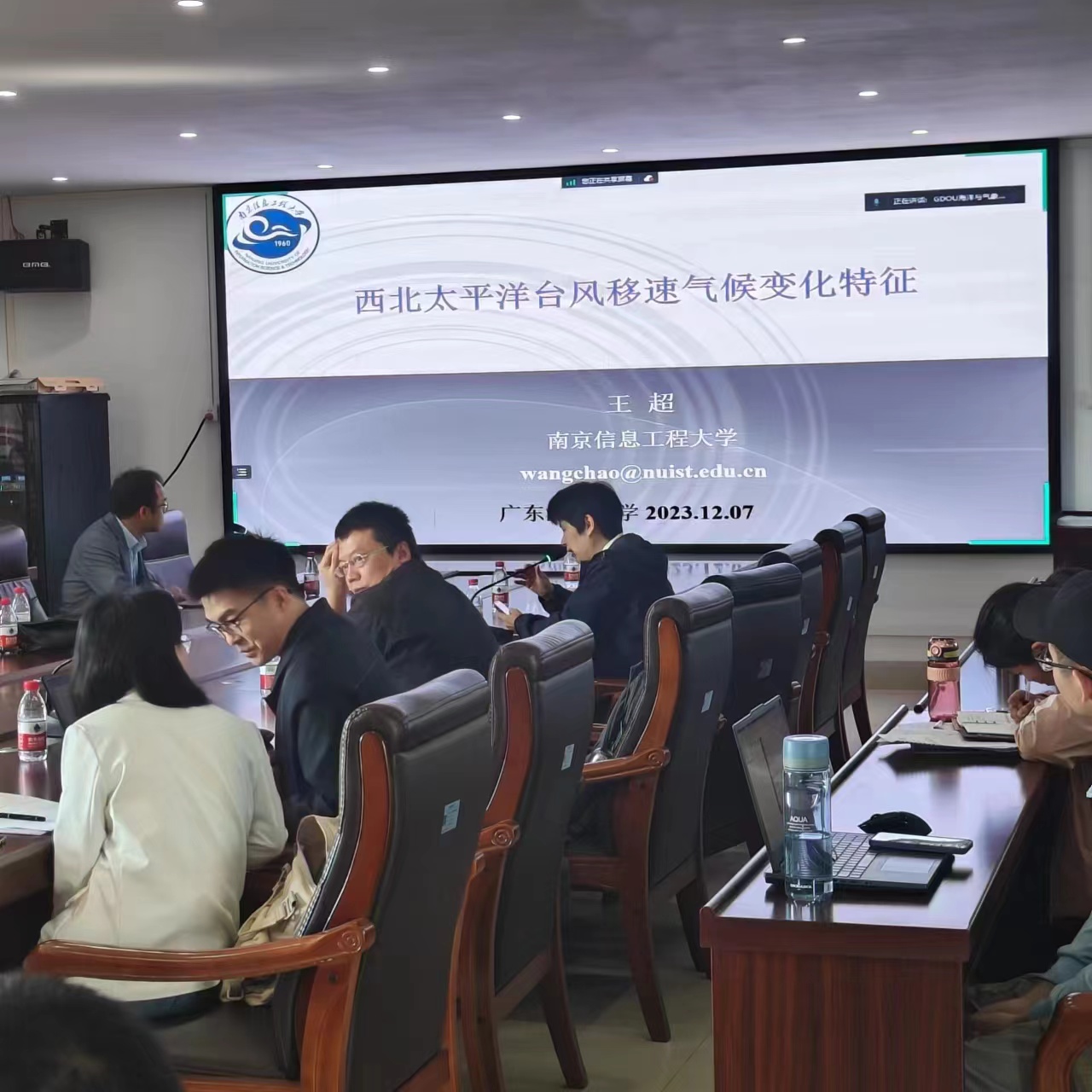 吴立广教授报告题目为:台风精细结构的数值模拟,他通过生动形象的例子深入浅出地讲解了龙卷尺度涡旋、台风眼墙极端上升气流、主雨带对流尺度结构、眼墙极端气压等内容。赵海坤教授报告题目为:热带波动在台风生成中的作用及其季节内预报尝试。他系统地讲解了季节内振荡对台风生成的大尺度调制作用、气候模式中的天气尺度波列、台风生成与热带波动的直接联系以及台风生成中季节内预报的尝试。曹剑教授对过去百年半球尺度季风降水的长期变化以及气温和气溶胶的对降水的影响进行了系统性的介绍。王超教授对西北太平洋台风移速的显著下降趋势进行了深入的探讨,并从引导气流和西北太平洋副热带高压两个方面进行了分析。几位教授同与会师生进行了热烈的学术讨论与交流,详细回答了爱壹帆