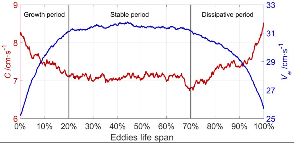 图1.南海中尺度涡平均移速(红线)和转速(蓝线)在生命周期内的变化。