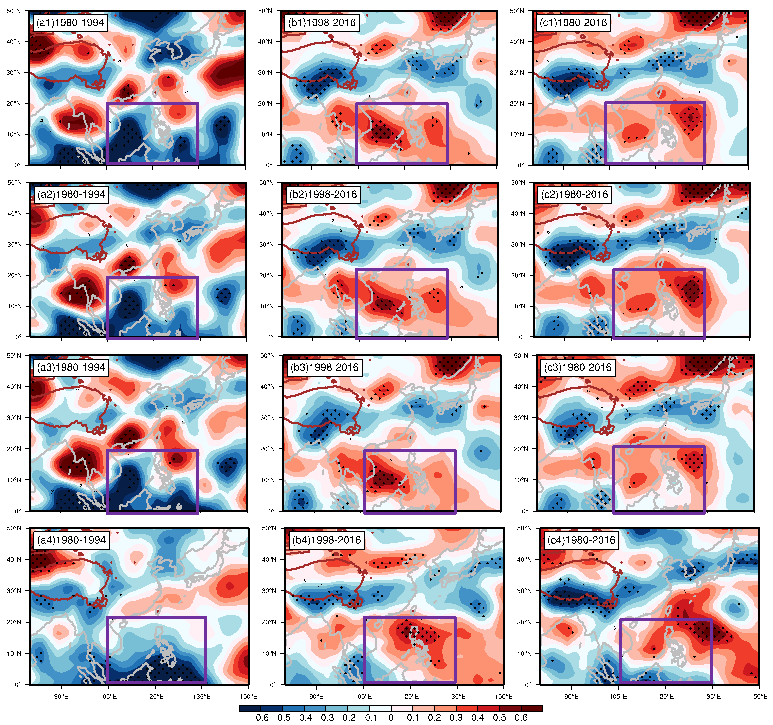 图1. TPST与GPCP的标准化偏回归系数:(a) 1980-1994年,(b) 1998-2016年,(c) 1980-2016年。1:台站资料,2:JRA55, 3: ERA5, 4: ERA-Interim资料。紫色区域代表本文研究的南海。Student’s t–test黑点表示通过90%信度检验。