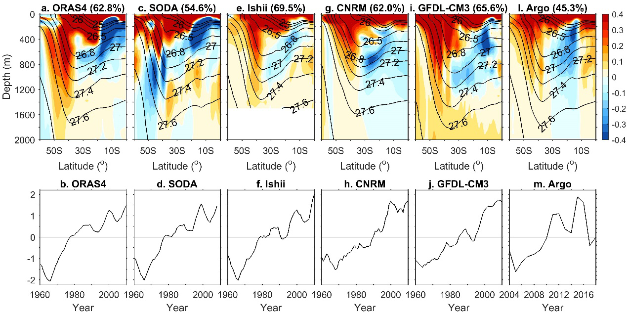 爱壹帆物理海洋学团队基于一系列再分析资料、模式输出和观测资料,发现南大洋正在经历的显著增暖可通过两种途径影响南印度洋次表层海水的热量再分配过程。首先,南大洋海表净热通量的增加导致了表层海水的增暖和局地更为深厚的对流层,通过抑制热带外大气的斜压不稳定迫使Hadley环流下沉支/西风带南移,进而在风应力旋度的驱动下整个副热带环流圈向极地偏移(图2),这导致南印度洋海水在位势密度槽的向赤道一侧变冷,向极地一侧变暖,产生图1所示的时空分布。