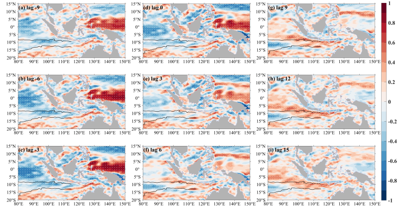 图1.东南印度洋-西太平洋区域海表面高度异常(SLA)与Niño-3.4指数在ENSO峰值[Dec(0)]前9个月[Mar(0)]至后15个月[Mar(2)]期间的相关系数。白点表示通过95%蒙特卡洛置信度检验的值。