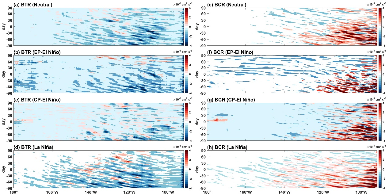 图3. 在(a,e)中性年、(b,f)EP型厄尔尼诺年、(c,g)CP型厄尔尼诺年以及(d,h)拉尼娜年期间,(a–d)赤道东太平洋海盆的正压转换率和(e–h)斜压转换率。-90至90天的定义与图2相同。