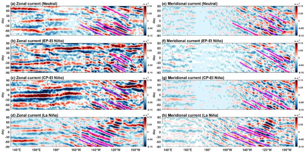 研究团队对智能模型反演海流进一步分析发现,季节内振荡分别解释了纬向和经向海流方差的10-30%和20-50%,并且在太平洋西部海盆和东部海盆表现出不同的特征。西太平洋海盆受热带大气季节内振荡(Madden-Julian Oscillations, MJO)主导,在厄尔尼诺期间的表层海流季节内振荡更为强烈。特别在东部型厄尔尼诺夏季和冬季期间,纬向流中显著的季节内振荡(-0.25–0.28 m s-1)几乎贯穿整个西部海盆。而在中部型厄尔尼诺冬季,强度更为显著(-0.27–0.32 m s-1)(图2a–d)。另一方面,尽管经向流的季节内振荡强度与纬向流相比显著减弱,但在东部型厄尔尼诺冬季期间,仍可向东延伸至150°W左右(图2e–h)。对于东太平洋海盆,季节内振荡主要来源于斜压不稳定性,并随着相速度向西传播,在拉尼娜期间,其传播速度和覆盖范围最大,而在厄尔尼诺期间则相反(图3)。