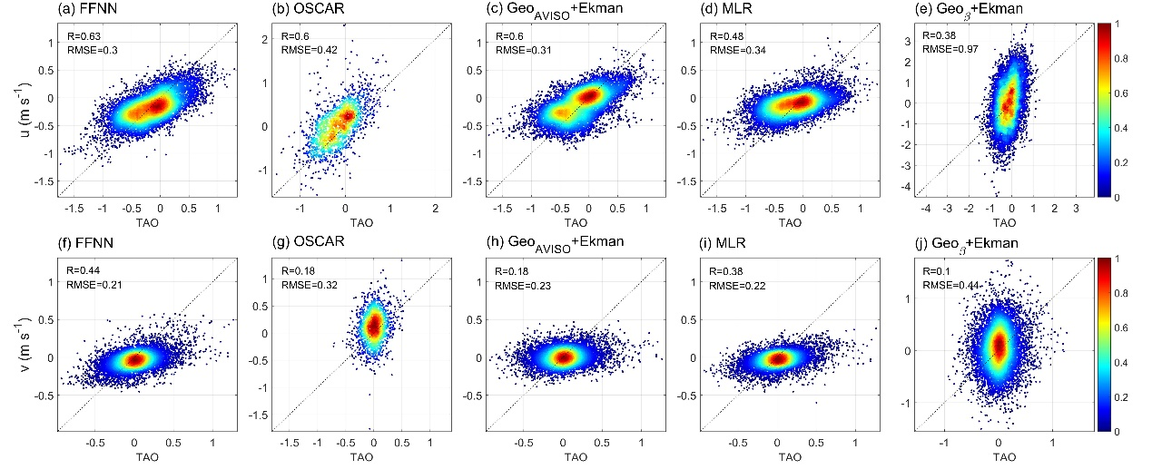 图1. (a,f)前馈神经网络模型、(b,g)OSCAR、(c,h)AVISO地转流与埃克曼流之和、(d,i)多元线性回归模型和(e,j)β地转流与埃克曼流之和的概率密度分布,与实测数据对比,并在左上角标注相应的相关系数和均方根误差(单位:m s⁻¹)。上(下)排分别对应纬向(经向)分量。