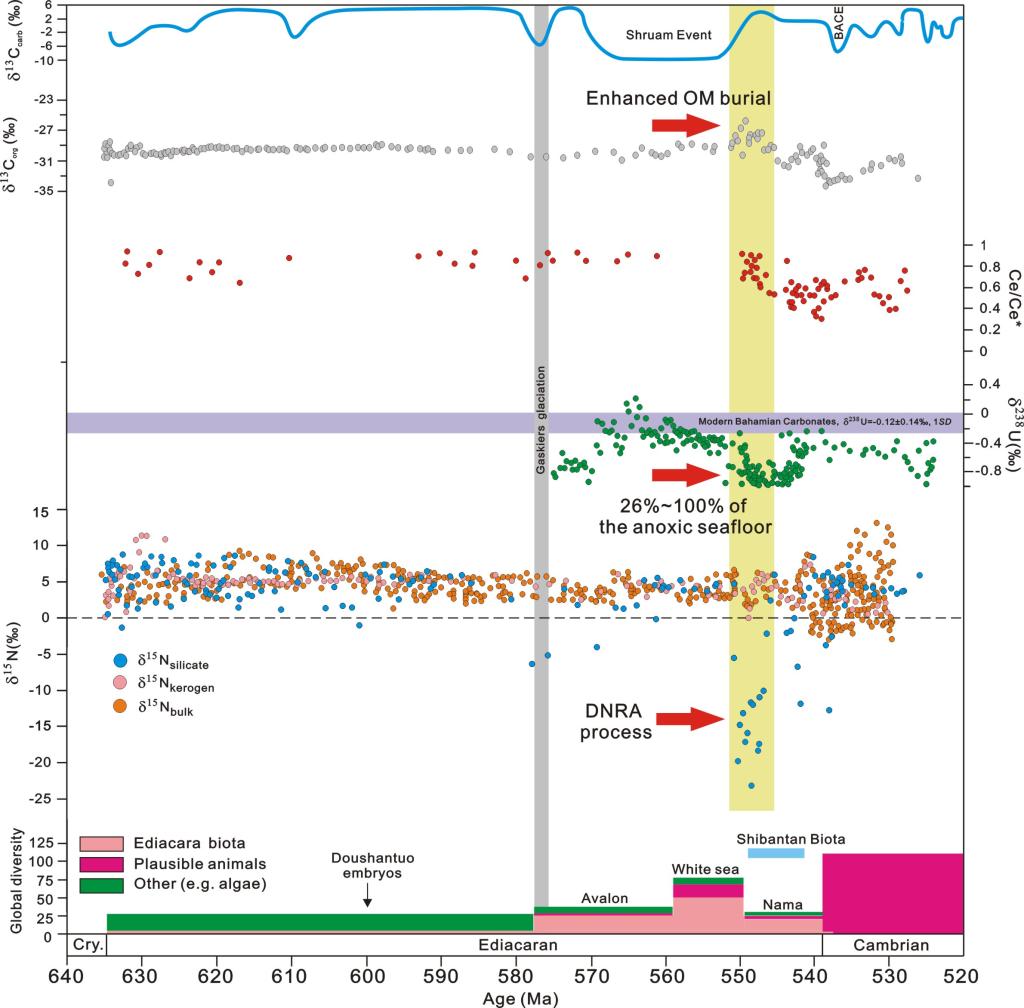 研究团队创新性利用相态特异性氮同位素数据,发现埃迪卡拉纪末期(约5.5亿年前)海洋深层水体普遍缺氧,并伴随强烈的硝酸盐异化还原为铵(DNRA)过程。这一过程导致硅酸盐结合氮同位素值急剧负偏(最低达-23.3‰),同时有机碳埋藏增加触发了碳同位素正漂移。研究指出,海洋缺氧扩张与生物可利用氮的减少可能严重限制了真核生物的生存空间,成为埃迪卡拉生物群衰落的关键环境压力。此外,尽管整体海洋缺氧,但微生物垫在沉积物表层形成的局部氧化微环境仍支持了"石板滩生物群”的生存,展现了生物对极端环境的适应性。该成果不仅为理解地球早期生命演化与环境协同作用提供了新视角,其创新的相态特异性氮同位素分析方法也为古海洋氧化还原条件重建提供了更可靠的工具。