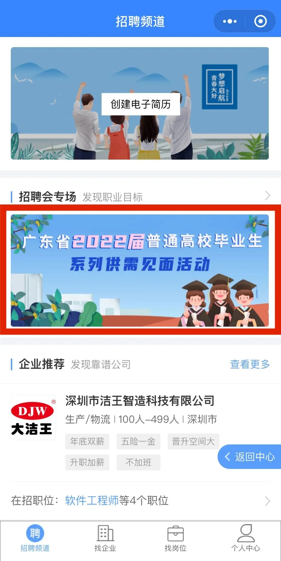 进入“广东大学生就业创业”小程序→点击毕业生求职→点击广东省2022届普通高校毕业生系列供需见面活动