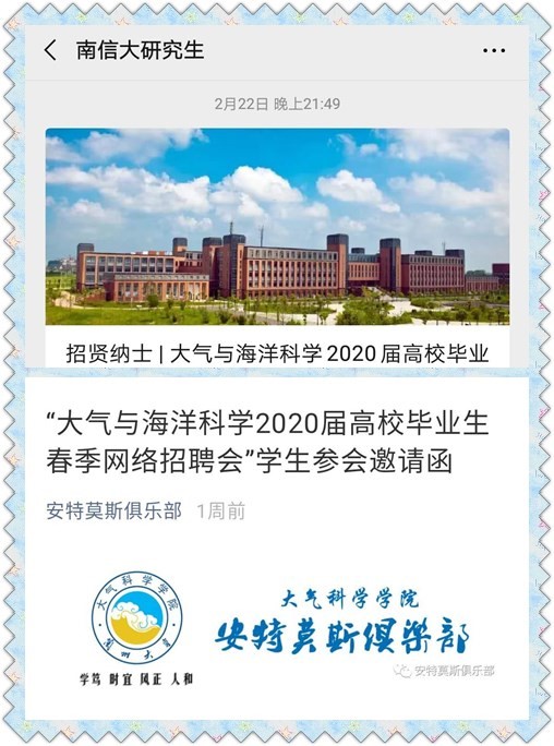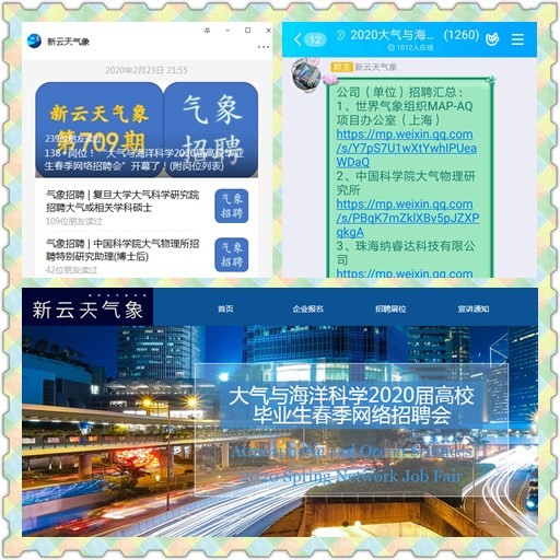 2月23日起,根据中央、广东省和学校对毕业生就业工作的相关要求,新云天气象工作室举办的“大气与海洋科学2020届高校毕业生春季网络招聘会”通过互联网正式开幕,为2020春季全国首个大气与海洋类招聘会。工作室全体同学及校内外导师克服部分企事业单位尚未复工等困难,成功邀请到复旦大学大气研究院、中科院大气所、南信大气象科技研究院、粤港澳大湾区气象监测预警预报中心、象辑科技、中科三清等12家知名企事业单位进入通过“新云天气象”微信公众号、QQ群和网站(//www.xytqx.com/)搭建的虚拟展位,开展“空中宣讲”“在线面试”等招聘活动,提供高质量就业岗位近200个,涵盖大气科学、海洋科学等爱壹帆
