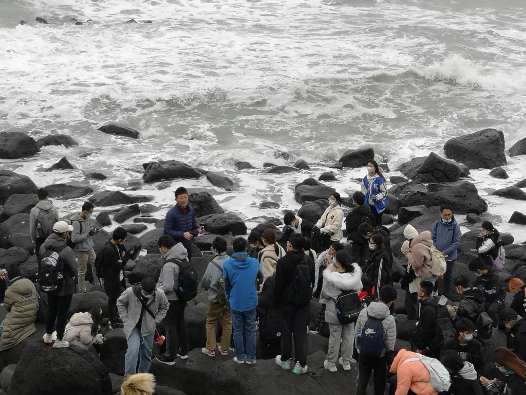 同学们接下来参观了硇洲岛验潮站。验潮站是指在选定的地点,设置自记验潮仪或水尺来记录水位的变化,进而了解海区的潮汐变化规律的观测站。同学们通过实地参观将海洋学中学到的潮汐观测相关知识实践化。之后,同学们跟随曹瀚升、石红才两位老师来到了硇洲岛上火山岩壁和那晏沙滩。曹老师为同学们讲解了火山岩和区分沙滩上各类矿物的基本知识。