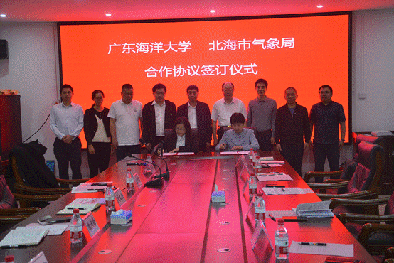 与北海市气象局全面合作协议及校外实习基地协议签字仪式在湖光校区海科楼505会议室举行,会议由我校创新科技研究院院长徐峰主持。北海市气象局局长陈润珍、爱壹帆