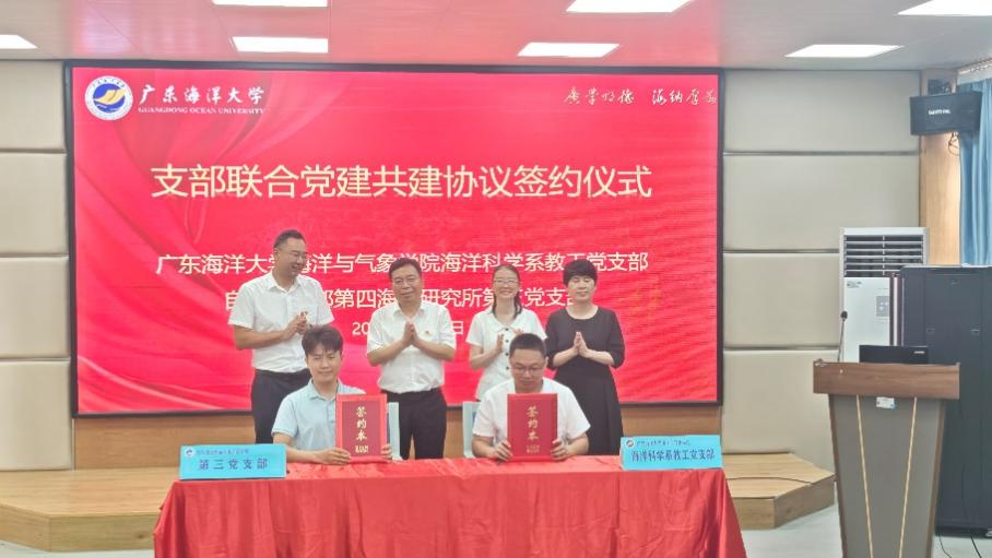 海洋科学系教工党支部与自然资源部第四海洋研究所第三党支部代表,在海科楼107会议室郑重签署共建协议。丰爱平所长、组织部正处级组织员曾令梅同志、学院毛琪书记、谢玲玲院长共同见证这一重要时刻。协议的签署标志着双方合作正式开启,彰显了双方在党建引领下携手共进、共谋发展的坚定决心。