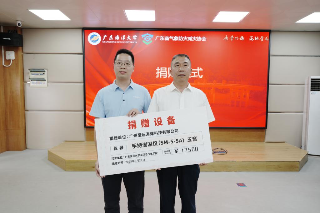 活动现场还举行了捐赠仪式,部分校友和社会企业慷慨解囊,为学校、学院建设和发展贡献力量。校友代表陈俊旺先生等人捐赠学校 10 万元,广州至远海洋科技有限公司捐赠手持测深仪(SM-5-5A)五套,总价值1.75万元。本次捐赠不仅为学院教学科研提供了有力支持,更彰显了海大人“感恩、奉献、传承”的精神品格。