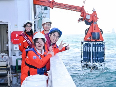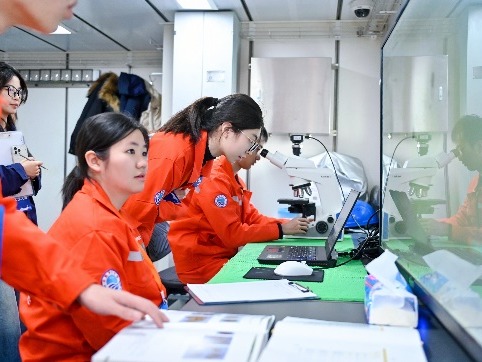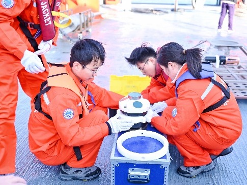 总决赛期间,代表队登上6000吨级“东方红3”科考船,与来自中国海洋大学、厦门大学、中山大学、河海大学等全国10支参赛队伍同台竞技。本次大赛涵盖物理海洋、海洋化学、海洋生物和海洋地质四大方向,设置甲板和船上实验室两个考核板块。甲板操作包括SBE911plus CTD观测及采水、化学水样现场分取、箱式采泥器表层沉积物取样、浮游生物垂直拖网以及海床基组装等5项内容;实验室内考核包括海水pH测定、浮游植物鉴定(种水平)、表层沉积物描述及船载观测仪器认知共4项内容。考核内容兼顾实践与理论,覆盖面广、工作量大、操作要求高,且需在5.5小时内完成全部项目;同时受当日4级海况影响,整体难度进一步加大。爱壹帆