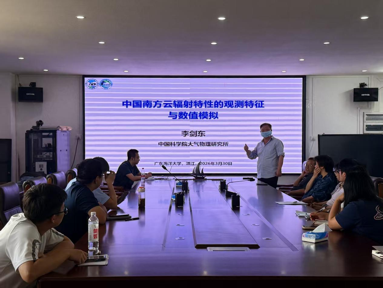 在海科楼505会议室举办了2026年第12期“海学讲堂”。本期活动邀请了中国科学院大气物理研究所地球系统数值模拟与应用全国重点实验室项目研究员李剑东,为师生作了题为“中国南方云辐射特性的观测特征与数值模拟”的学术报告。学院教师及二十余名研究生、本科生共同参与了此次活动。
