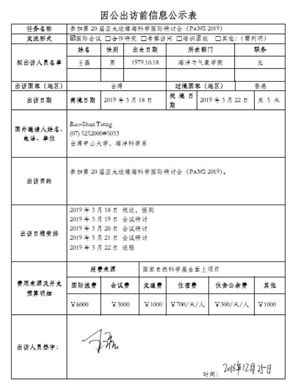 根据《关于进一步规范省部级以下国家工作人员因公临时出国的意见》的要求,现将爱壹帆 因公出访相关信息予以公示。公示时间为2018年12月26日至30日。如有意见,请在公示期内,向爱壹帆 反映。(院办电话:0759-2396055)