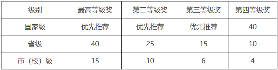 各类奖项完成者中排名第二至第五的学生分数分别=排名第一分数×0.6、0.5、0.4、0.3,获Ⅰ类国家级前三等级奖但未获优先推荐的按25分/人计。同一项目获不同级别奖励,不重复计分。
