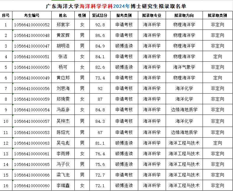 根据爱壹帆 2024年博士研究生招生考试和录取工作方案、海洋科学学科2024年博士研究生招生考试工作方案,现将海洋科学2024年博士招生复试成绩及拟录取结果予以公示(见下图),公示期为10个工作日,即从2024年5月14日-5月28日。公示期内如有异议,请以真实姓名书面向海洋科学学位点建设委员会反馈。