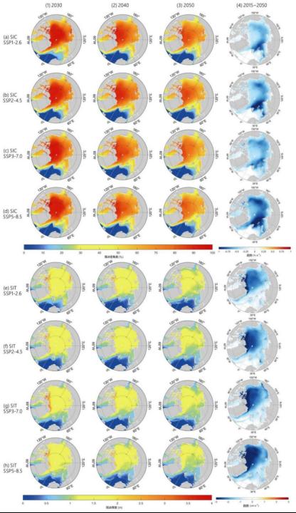 图31. 4种强迫情景(SSP1-2.6、SSP2-4.5、SSP3-7.0、SSP5-8. 5)下海冰密集度和海冰厚度在2030年(第一列)、 2040年(第二列)、2050年(第三列)的空间分布,以及2015-2050年的平均变化趋势(第四列)