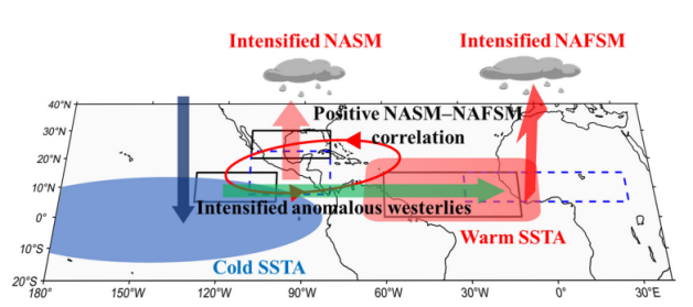 图28.热带太平洋-大西洋跨洋盆海温偶极子影响北美夏季风-北非夏季风年际变异同步性的物理过程示意图。图中的黑色实线框分别表示用于定义北美夏季风、北非夏季风环流指数,蓝色虚线框分别代表北美夏季风和北非夏季风降水核心区。热带大西洋的暖海温异常(红色阴影)和热带太平洋的冷海温异常(蓝色阴影)的差异形成热带太平洋-大西洋跨洋盆海温偶极子结构特征。