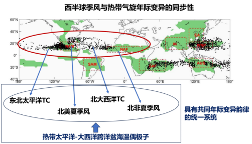 图29.热带太平洋-大西洋跨洋盆偶极子型海温异常的调控作用可以引起西半球季风与热带气旋年际变异的同步性,西半球季风、西半球热带气旋、热带太平洋-大西洋跨洋盆海温异常可以形成具有共同年际变异韵律的统一气候系统。