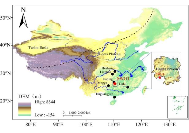 亚高山泥炭地对气候变化较为敏感,且受人类活动干扰较小,因此是重建古气候和人类活动的理想载体。为了更好的理解中国南方亚高山泥炭地十万古田(SWGT)全新世以来区域内环境变化与人类活动之间的相互关系(图43),本研究对SWGT泥炭地的δ13C、烧失量(LOI)、磁化率(MS)、化学风蚀指数(CIA)以及一些地球化学元素比值Al/K、Zr/Rb等多代用指标进行了气候变化和人类活动的分析。通过SWGT的各项指标结合区域内的相关记录进行分析,结果表明:在11600-9000 cal yr BP期间,东亚夏季风(EASM)较弱,气候相对干燥;在9000-4000 cal yr BP期间,EASM较强,气候较为湿润;在4000 cal yr BP以后,EASM变弱,气候又逐渐变得干燥。进一步的分析结果表明,在轨道时间尺度上,区域内的气候变化主要受到太阳辐射、高纬度冰盖面积、ITCZ移动和ENSO活动的影响。此外,近1000年以来,气候变化本身与泥炭地各项代用指标发生一定程度的解耦。此时SWGT泥炭地中MS以及重金属浓度的增加与湖南省人口增加是一致的,因此,可以推断此时人口的不断增长以及耕地和采矿的不断增加使得土壤侵蚀加剧和重金属含量增多(图44)。但是值得注意的是,可能受到海拔效应的影响,各项表示人类活动的指标表明在1000 AD以来人类活动才对该地产生显著影响(图44)。上述重建结果为将来进一步理解全新世气候变化与人类活动之间的相互作用和影响提供了基础性证据。