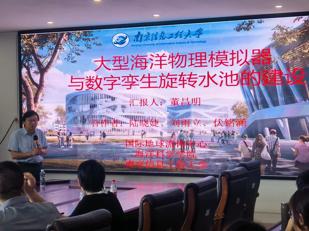 举行了2024年第8期海学论坛,本次海学论坛邀请了南京信息工程大学海洋科学院长董昌明在海科楼505会议室为大家带来题为“大型海洋物理模拟器-旋转水池的建设和应用”的专题报告,并进行南京信息工程大学研究生招生宣传,来自学院的院长、相关老师、本科生等多人线下参加了报告。