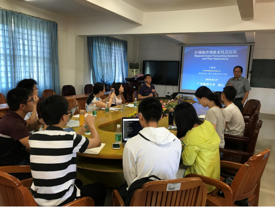 报告会上,王教授对海气相互作用及预报,区域海洋数值模拟及预报,海洋模式研发等方面的国内外研究进展进行回顾,着重介绍大尺度海气相互作用、海洋模式研发及应用、区域海洋动力过程等领域。他还将自己参与研发的多个美国海域的区域海洋预报系统进行了介绍,展示了其在船舶航道设计、海洋溢油事件和海洋生物保护等方面所发挥的巨大作用。