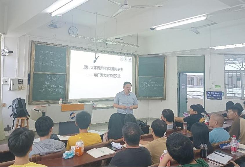 9月25日,蔡明刚教授旁听了学院副院长陈法锦教授主讲的本科生课程《海洋生物地球化学》,接着,蔡教授结合课程教学大纲内容,做了主题授课。在课堂上,蔡教授从地球系统科学的角度介绍了海洋环境污染问题的本质,深化同学们对海洋生物地球化学的认识,增强了同学们利用地球科学系统的思维去研究海洋问题的能力。最后,还与同学们积极互动,引导大家深入思考。通过蔡教授的指导,爱壹帆