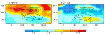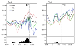 本研究发现青藏高原(TP)与热带印度洋(TIO)夏季均为强的热源区,热力对比最明显。两个强热源区分别位于SASM对应的强斜压区的北侧和南侧,且这两个热源均由对流层上层的深对流加热控制。夏季TP和TIO的热力对比通过对流层上层的经向温度梯度影响南亚季风环流。当热力对比显著增大时,温度经向梯度增大,低空西风气流和高空东风气流增强,进一步导致SASM区域大气斜压性增强,季风环流增强使得孟加拉湾和印度北部及中南半岛部分地区降水增加。