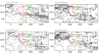 热力对比异常时通过95%显著性检验的低空(a1,b1)和高空异常风场(a2,b2)