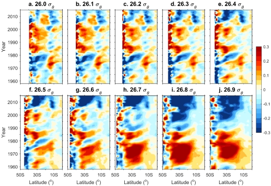 图3 纬向平均的位势温度异常沿26.0-26.9σθ等密度面的时空分布。