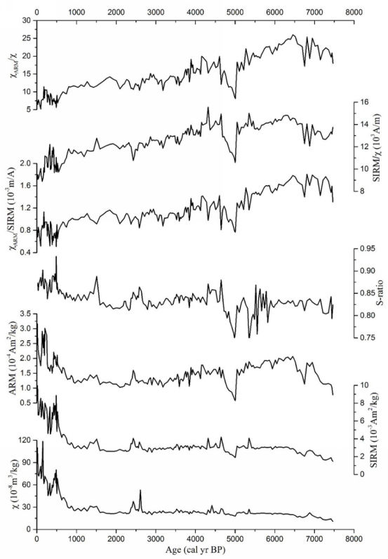 海洋地质团队成员黄超利用采自南海北部大陆架粤西泥质区的YJ Core岩芯做为研究对象(图1),通过210Pb和AMS 14C两种测年方法建立YJ Core岩芯的年龄–深度模式,开展系统的环境磁学研究工作,分析研究区沉积物的磁性参数的变化特征,并探讨研究区沉积物磁性特征的环境意义。该研究获取了研究区域过去7500年以来的高分辨环境磁学记录。研究表明YJ Core岩芯沉积物中的磁性矿物为碎屑成因,磁性矿物主要是磁铁矿,同时也含有少量的赤铁矿(图2)。YJ Core岩芯沉积物中磁性特征对气候变化响应灵敏,记录了过去7500年以来东亚夏季风的演变历史(图3)。7500–6800 cal yr BP期间,成壤作用的环境磁学χARM/χ和χARM/SIRM比值都依然保持相对较高的值,反映强盛的东亚夏季风;6800–3500 cal yr BP期间,磁性矿物含量指标ARM和磁性矿物粒度指标χARM/χ和χARM/SIRM的含量相对较高,可能反映相对湿润的气候,进而可能指示该时期相对强盛的东亚夏季风;3500–2000 cal yr BP期间,ARM和χARM/χ和χARM/SIRM相对较低,表明东亚夏季风相对较弱;近2000年以来,由于人类活动逐渐增强,YJ Core岩芯沉积物环境磁学指标可能不仅仅受气候变化的控制,而且可能主要受到日益增强的人类活动的影响。